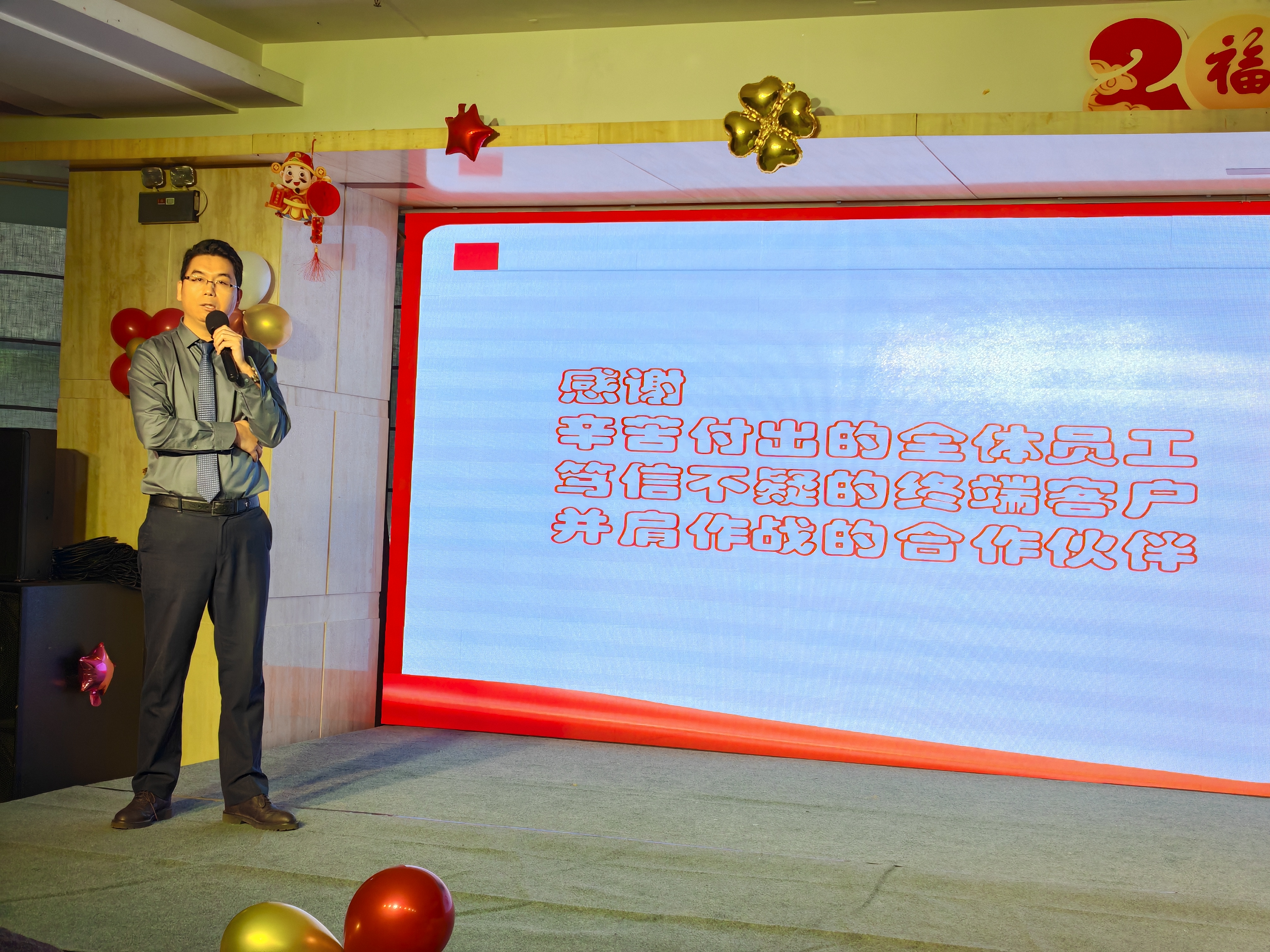 威锐达总经理、锐益达董事长张总登台致辞。他首先向全体员工一年来的辛勤付出表示感谢,也衷心感恩客户一直以来的信任与支持,同时回顾了团队在过去一年的奋斗与成长。在展望2026年时,张总清晰擘画了发展蓝图,并以坚定有力的话语鼓舞全员同心前行,现场氛围振奋人心。